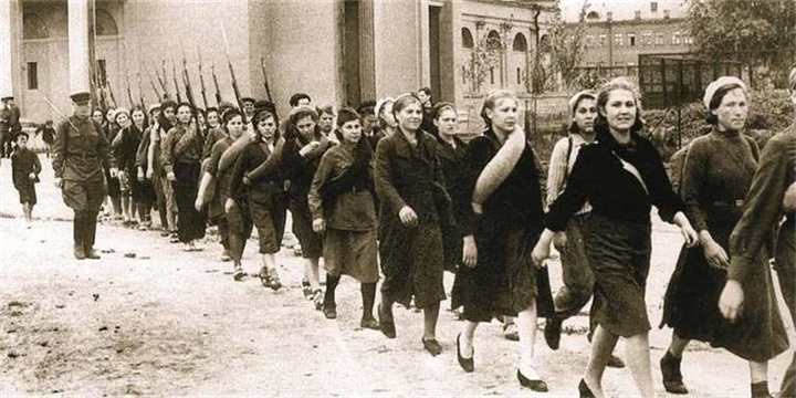 Советские девушки-добровольцы направляются на фронт. Лето 1941 года