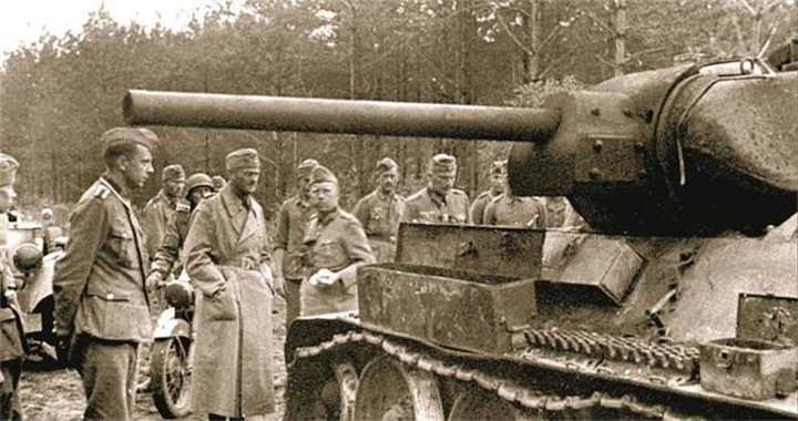 Командир 260- й пехотной дивизии генерал-лейтенант Ганс Шмидт (третий слева) и командир 43-го армейского корпуса (XXXXIII Armeekorps) генерал Готхард Хейнрици (четвертый слева) осматривают сгоревший под Гомелем советский средний танк Т-34. Август 1941 г.