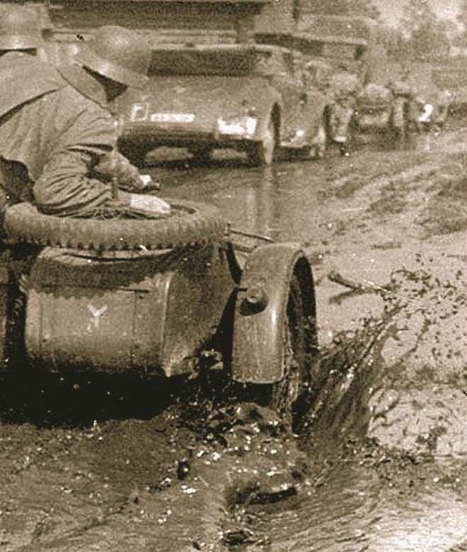 Части немецкой 7-й танковой дивизии движутся через советскую деревню. Лето 1941 года