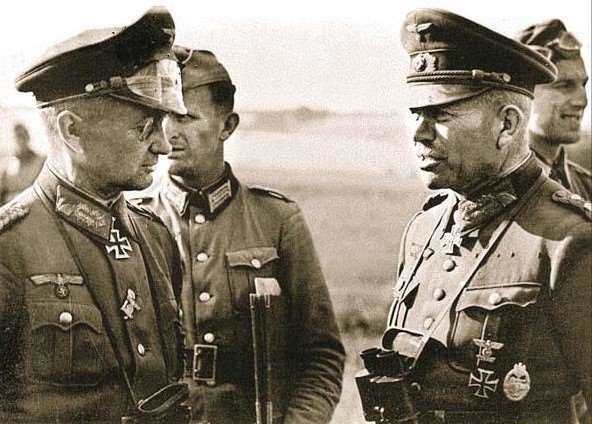 Командир немецкой 3-й танковой дивизии (3. Panzer-Division) в составе 2-й танковой группы генерал-майор Вальтер Модель (слева) и командующий 2-й танковой группой генерал-полковник Гейнц Гудериан (справа). Лето 1941 г.