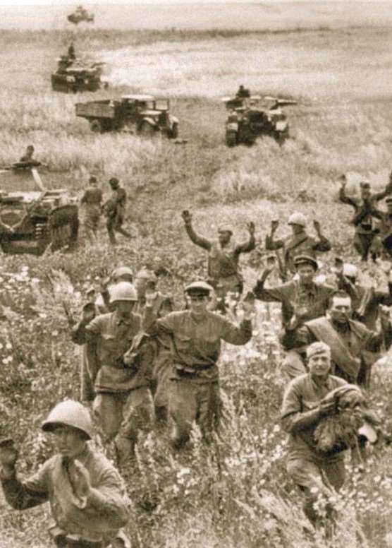 Бойцы и командиры Красной Армии сдаются в плен немецким танкистам 9-й танковой дивизии Вермахта. Украина, август 1941 г.