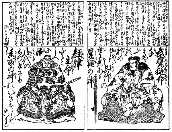 Воинские божества Фуцунуси-но микото (слева) и Такэмикадзути-но микото (справа). Со старинной гравюры
