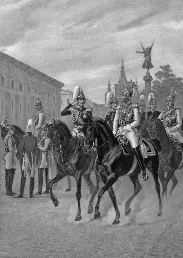 Император Николай I и цесаревич Александр Николаевич в военной форме. Слева – офицеры. Литография по оригиналу Карла Пиратского. 1849