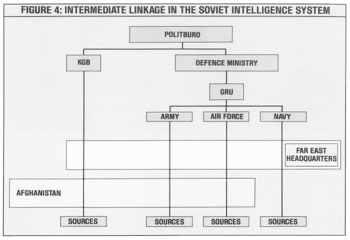 Далее эксперты описали структуру советской военной разведки так: в подчинении министра обороны – ГРУ, в подчинении главнокомандующих тремя видами Вооруженных Сил – разведывательные управления Сухопутных войск, ВВС и ВМФ.
