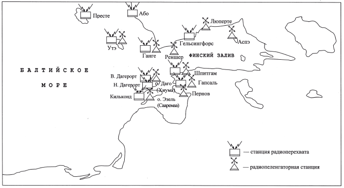 Результаты радиоразведывательной деятельности накануне войны, а также в первые дни военных действий убедили командование флотов в необходимости создания помимо БНПиС Службы связи станций радиоразведки, оснащенных соответствующим радиооборудованием, техникой и специалистами – радистами-разведчиками и дешифровальщиками (хотя об этом свидетельствовал гораздо ранее еще опыт Русско-японской войны 1904–1905 гг.). Наиболее интенсивно и успешно эта работа развернулась на Балтийском флоте. Так, на побережье Балтики уже в августе 1914 года для ведения радиоразведки были выделены на БНПиС южного (Гапсаль (Хаапсала), Кильконд (Кихелькона, о. Эзель), В. Дагерорт (о. Даго)), западного (Преете, Утэ, Або (Турку)) и северного (Гельсингфорс (Хельсинки) – два, Ганге (Ханко)) районов по три радиоприемника. В дальнейшем эти БНПиС были оформлены как разведывательные станции (радиоперехвата и радиопеленгаторные).