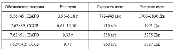 В таблице 1 представлены общепринятые значения, но надо учитывать расхождения в зависимости от модели патронов. Представлены данные, которые позволяют вынести суждение. Как видно по данным в таблице 1, в НАТО приняли на вооружение винтовочный патрон «слабее русского».