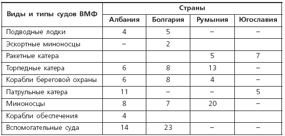 Наиболее слабыми (если исключить Албанию) по оснащению и численности являлись болгарские ВМФ, насчитывавшие около 6 тыс. человек персонала, 2 подводные лодки, 2 эскадренных миноносца, 8 кораблей сопровождения, 6 тральщиков и 35 вспомогательных судов[654]. Незначительными силами НРБ обладала и на р. Дунай, где базировалась Дунайская флотилия.