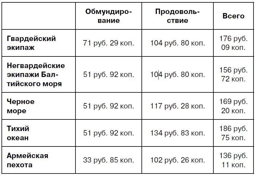 Матросы получали питание и обмундирование натурой. Количество и качество предметов обмундирования моряков было выше, чем в сухопутной армии (см. приложение 4).