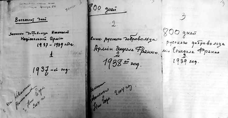 В документальных фондах Центрального музея Вооруженных Сил Российской Федерации (ЦМВС) в коллекции общества «Родина» (Ф. 4/47) хранятся воспоминания В.И. Ковалевского, А.А. Трингама и Н.В. Шинкаренко, позволяющие увидеть изнанку участия русских эмигрантов в войне на стороне националистов.