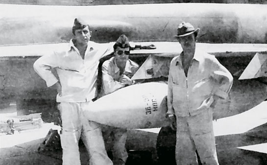 Подвеска зажигательных баков ЗБ-500Ш на самолете МиГ-21бис. Крайний слева -заместитель командира 927-го полка Н. Карев