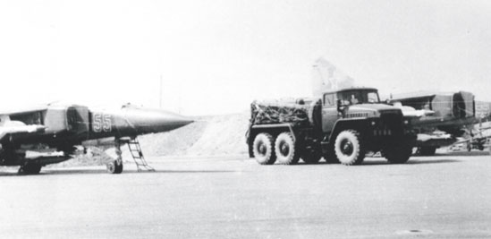 МиГ-23МЛ щучинского 979-го иап в дежурном звене Баграма. Рядом наготове стоит АПА-5Д для запуска двигателей самолетов