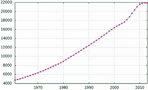 Демографическая кривая Сирии. По вертикали – население, тыс. человек, по горизонтали – год [36]