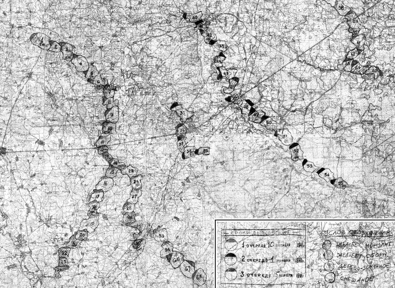 В ходе строительства обнаружилось много неверностей, а именно: стремление вытащить сооружения на передний край, к противотанковому рву, ближе 50–30 метров, близко огневые точки одна от другой (ближе 100 м), много фронтального огня и мало флангового и косоприцельного. Местами не был протрассирован кольями противотанковый ров. Из-за этого в ходе работы часть уже сделанного приходилось бросать, проводить дополнительную рекогносцировку и излишнюю работу».