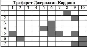 Так, кардинал Ришелье использовал прямоугольник размером 7x10. Для длинных сообщений прямоугольник использовался несколько раз. Прорезы трафарета размещались в позициях (1,8) (2,9) (3,6) (4,5) (4,6) (5,1) (5,6) (5,7) (5,9) (6,2) (6,10) (7,9) (7,10).