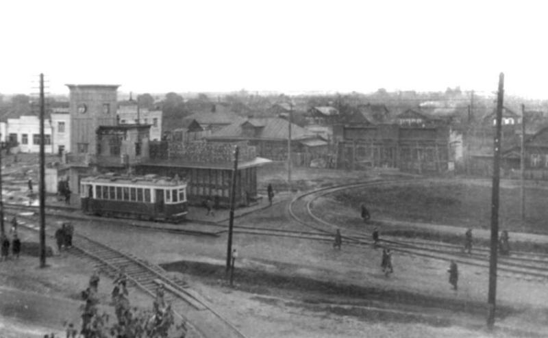 Трамвайная остановка у Калининского вагоностроительного завода. Довоенное фото.