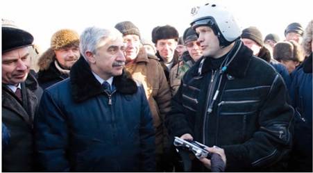 Заслуженный летчик-испытатель России Сергей Богдан докладывает генеральному директору компании «Сухой» Михаилу Погосяну о впечатлениях от первого полета. Крайний слева — генеральный директор КнААПО Александр Пекарш. Комсомольск-на-Амуре, 29 января 2010 г.