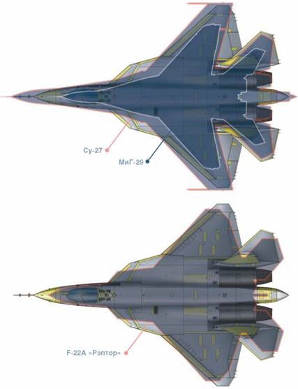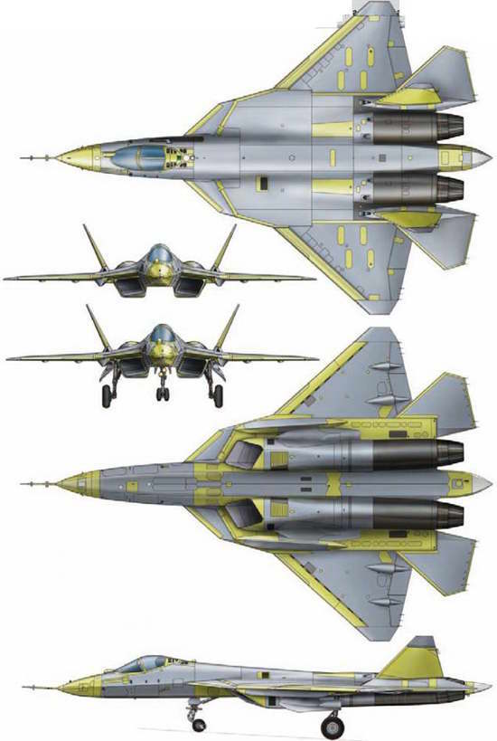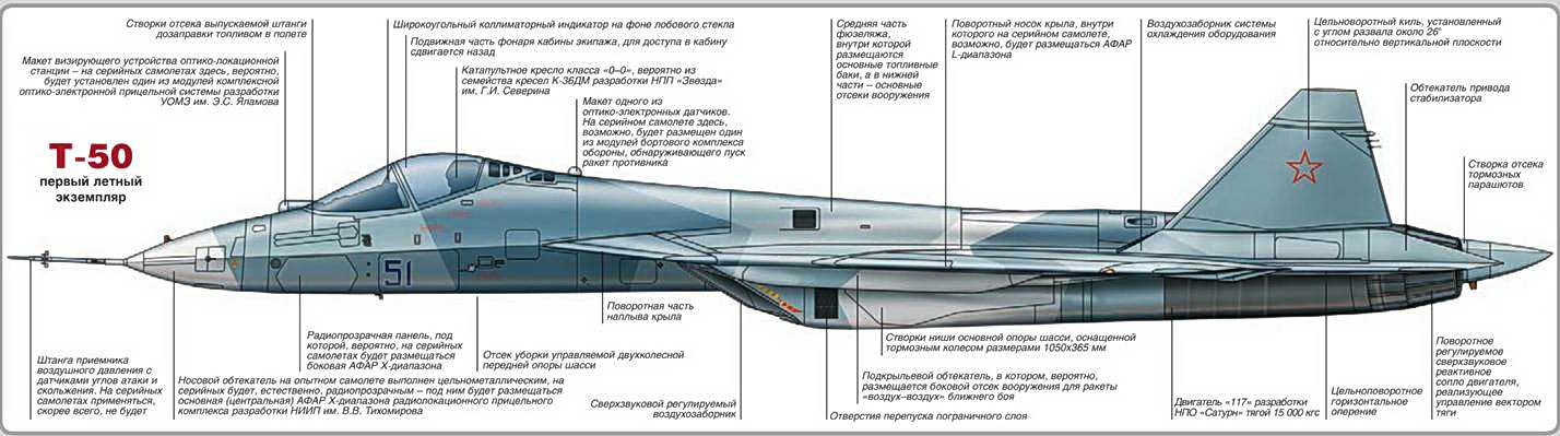 К первым исследованиям по программам истребителей пятого поколения приступили в нашей стране и США уже почти три десятилетия назад. Их результатом стало создание в Соединенных Штатах самолета Р-22А «Рэптор», официально состоящего на вооружении ВВС США с 2005 г. Через пару лет в войска сможет начать поступать и другой американский истребитель пятого поколения — более легкий F-35 «Лайтнинг II». В нашей стране в середине 90-х гг. прошлого столетия были изготовлены опытно-экспериментальные образцы своих истребителей пятого поколения — Многофункционального истребителя (МФИ) компании «МиГ», известного как «изделие 1.44», и экспериментального самолета с крылом обратной стреловидности С-37 (Су-47) «Беркут» ОКБ Сухого. В силу сложной экономической обстановки в России в то время и изменения требований к самолетам такого типа дальнейшего развития эти проекты тогда не получили. Однако около десяти лет назад на «Сухом» приступили к разработке нового проекта истребителя пятого поколения, который воплотил в себя все новейшие достижения отечественной промышленности в области авиационных конструкций, материаловедения и технологий, силовых установок, радиоэлектронного оборудования и авиационного вооружения. В 2002 г. этот проект одержал победу в тендере ВВС России и был принят к практической реализации. Пройдя все необходимые этапы разработки, компания «Сухой» смогла в прошлом году изготовить первые опытные экземпляры Т-50, а недавно и приступить к летным испытаниям.