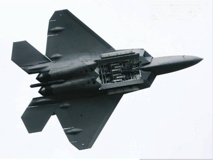 Серийный истребитель F-22A «Рэптор» во время своего первого публичного показа за пределами США, на авиасалоне в Фарнборо в июле 2008 г., демонстрирует открытые отсеки вооружения