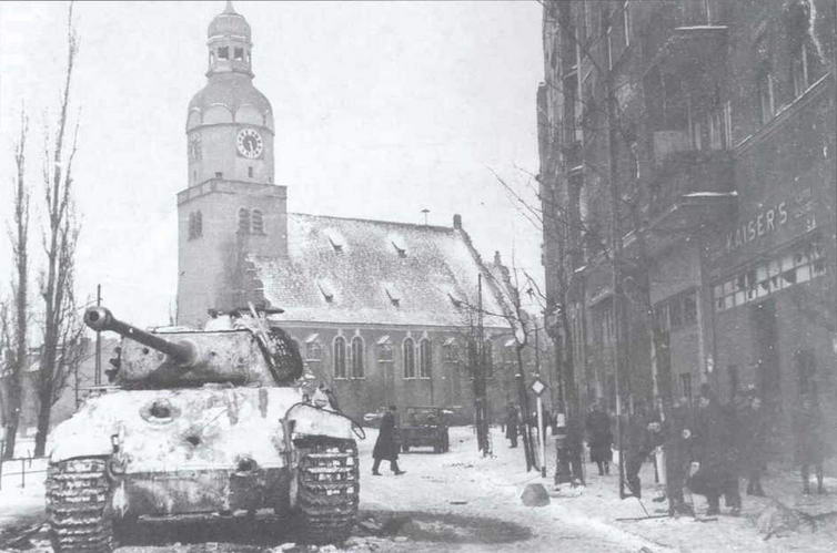 «Пантера» Ausf.G, подбитая на улицах Познани в январе 1945 года. Обращают на себя внимание две сквозные пробоины в лобовой броне корпуса