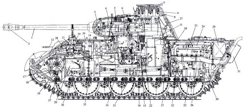 1 — 75-мм танковая пушка KwK 42 L/70; 2 — дульный тормоз; 3 — маска пушки; 4 — телескопический монокулярный прицел TZF 12Ь; 5 — боекомплект 7,92-мм патронов; 6 — башенный вентилятор; 7 — рельс для крепления зенитного пулемета; 8 — командирская башенка; 9 — прибор наблюдения; 10 — вентилятор корпуса; 11 — сиденье командира; 12 — пулемет MG 34; 13 — панель приборов; 14 — радиостанция; 15 — сиденье наводчика; 16—сиденье заряжающего; 17—педаль сцепления; 18 — педаль тормоза; 19 — педаль акселератора: 20 — коробка передач; 21 — аккумуляторная батарея; 22 — компрессор вентилятора; 23 — двигатель Maybach HL 230Р30; 24 — воздушный фильтр; 25 — масляный радиатор: 26 — генератор; 27 — кормовой башенный люк; 28 — баллон автоматической системы пожаротушения; 29 — бак системы охлаждения; 30 — выхлопной коллектор; 31 — ящик для амуниции: 32 — масляный фильтр; 33 — редуктор механизма поворота башни; 34 — карданный вал; 35 — главный фрикцион; 36 — сиденье водителя: 37 — механизм поворота; 38 — прибор наблюдения водителя; 39 — гидроцилиндр открывания люка