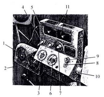 1 — тахометр: 2 — спидометр; 3 — вольтметр; 4,5 — переключатели ламп; 6 — амперметр; 7 — сигнальная лампа; 8 — замок зажигания; 9 — кнопка стартера с контрольной лампой; 10— штепсельная розетка для включения переносной лампы; 11 — коробки предохранителей