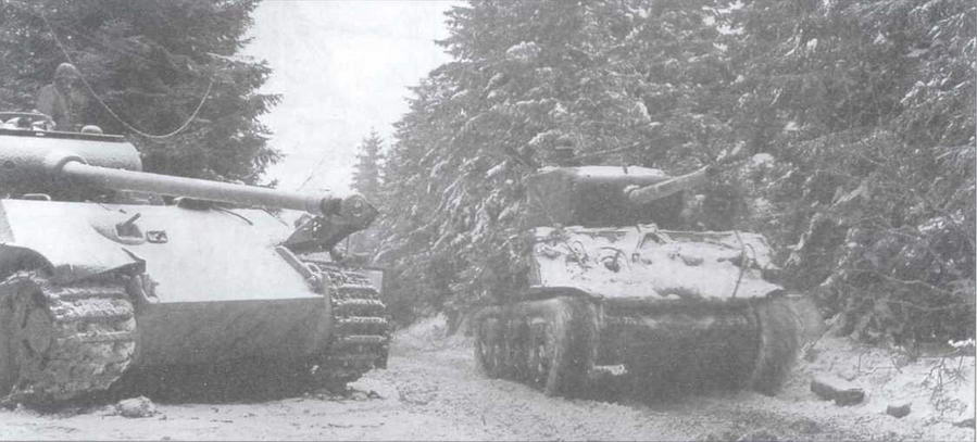 «Шерман» M4A3(76)W проезжает мимо подбитой «Пантеры» Ausf.G. Бельгия, январь 1945 года