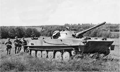 ПТ-76 поздних выпусков (до 1957 года). У этой машины опорные катки позднего типа (с выштамповками) и прямоугольные 95-литровые дополнительные топливные баки.