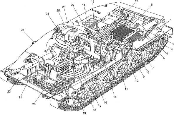 1 — задний левый габаритный фонарь; 2 — труба левого водомета; 3 — ведущее колесо; 4 — бортовая передача; 5 — водоотливная труба; 6 — коробка передач; 7 — короб эжектора; 8 — броневая решетка; 9 — масляный радиатор; 10 — водяной радиатор; 11 — клапанные коробки механизма защиты двигателя от попадания воды; 12 — двигатель; 13 — масляный бак; 14 — топливный бак; 15 — воздухоочиститель; 16 — сиденье командира; 17 — пол боевого отделения; 18 — ВКУ; 19 — укладка 76-мм выстрелов; 20 — сиденье механика-водителя; 21 — аккумуляторы; 22 — волноотражательный щиток; 23 — правый передний габаритный фонарь; 24 — перископический прибор наблюдения МК-4; 25 — крышка башенного люка; 26 — укрывочный брезент; 27 — вентилятор.