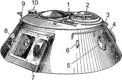 1 — крышка люка башни; 2 — командирская башенка; 3 — поручень; 4 — колпак вентилятора; 5 — стакан антенного основания; 6 — крюк для подъема башни; 7 — рамка пушки; 8 — амбразура; 9 — кронштейн фары ночного видения; 10 — наружная часть установки призменного перископического прибора заряжающего.
