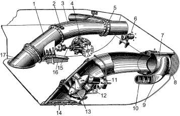 1 — корпус водяного насоса; 2 — трубка для заправки смазки; 3 — водопроточная труба; 4 — внутренний редуктор; 5 — сопловый патрубок; 6 — корпус привода к заслонке; 7 — кормовой патрубок; 8 — заслонка; 9 — труба заднего хода; 10 — броневая перегородка; 11 — картер привода; 12 — лопатки направляющего аппарата; 13 — рабочее колесо; 14 — решетка; 15 — карданный вал; 16 — постамент; 17 — приемный патрубок.