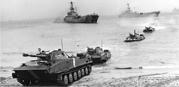 Танки ПТ-76Б высаживаются со средних десантных кораблей проекта 773. Учения «Осень-88», сентябрь 1988 года.