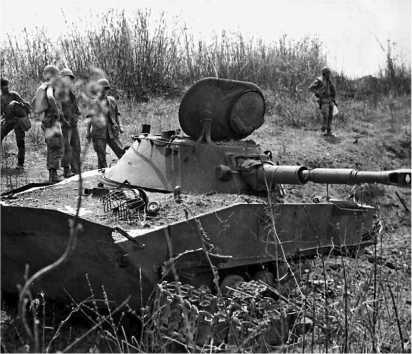 Американские солдаты осматривают подбитый северовьетнамский ПТ-76.