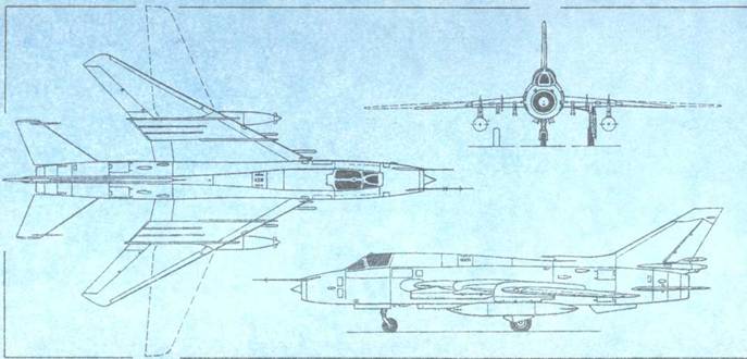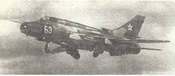 Дополнительные сведения. Летом 1967 г на авиационном параде в Домодедове был продемонстрирован вариант самолета Су-7 с изменяемой геометрией крыла, получивший индекс «С-22И» и ставший прототипом истребителя-бомбардировщика Су-17 Первый полет на С-22И выполнил летчик-испытатель В. Ильюшин 2 августа 1966 г Через три года Су-17 был запущен в серию. На самолете установили трехсекционные предкрылки и створки подпитки двигателя, увеличившие взлетную тягу, улучшили обзор из кабины летчика.