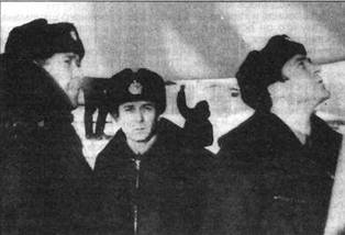 У самолета Ту-142 перед вылетом на первое применение ракето-торпед (1971 г.) Слева направо: командир экипажа летчик В. Шаманский, штурман-навигатор Ю. Моисеев, штурман по боевому применению Г. Хромцов.