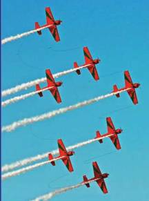 Вверху в центре: смешанный ромб из пары Су-27УБ и пары МиГ-29УБ был наречен местной прессой «Русские Стрижи» Вверху справа: обладатель золотых медалей Кубка мира марокканская группа «Ла Марш Верте» демонстрирует групповой пилотаж с «веревочками» В правом верхнем углу: самая необычная «пилотажная группа» в Аль Айне – Кристиан Муллек и его 12 диких гусей Справа внизу: на таких Су-26 российские пилотажники заняли четыре призовых места