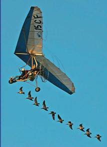 Пожалуй, наиболее необычную пилотажную группу в Аль Айне представлял француз Кристиан Муллек (Christian MouUec), выступавший на мотодельтаплане, в едином строю с которым летало … 12 дрессированных диких гусей (подобную «пилотажную группу» можно было недавно видеть в американском художественном фильме «Летите домой» (Fly away home), демонстрировавшемся по российскому телевидению).