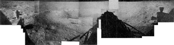 109:56 – Еще минута, TV-камера установлена – в 17-ти метрах от LM, и земляне увидели на своих телевизионных экранах лунный модуль в "полный ройт". Еще 2 минуты ЦУП корректирует наводку камеры на объект (109:59) и еще – 3 минуты Нейл, медленно поворачиваясь Против часовой стрелки, показывает землянам круговую панораму места посадки. На горизонте не было ни гор, ни даже сколь- нибудь заметных изменений рельефа: казалось, они сели на плоской, как стол, равнине…