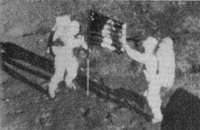 В кадре наружной TV-камеры Нейл стоял ближе к LM (слева), Базз справа от модуля и флага. Поза Армстронга напоминала расслабленную стойку боксера, поза Олдрина была напряженной, наполненной торжественностью момента.