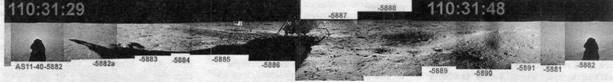110:23:00. Через три минуты Олдрин оставил командира собирать и упаковывать образцы. Сам же вооружился фотокамерой и отошел на 9-10 метров на восток от LM, повернул на 90° на юг, прошел еще 10-11 метров и в 110:31:29 сфотографировал "панораму 2" (pan.2: AS 11-40-5881-91).