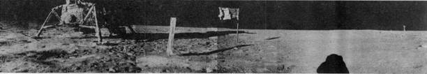 Следующее действие – натягивание Армстронгом направляющей чалки LESO, конец которой был выброшен им наружу по ходу из LM и которая свисала теперь с площадки между трапом и раскрытым MESA. Базз аккуратно спускает по LEC сумку Нейлу, на что уходит 4 минуты. Сумка спустилась, Нейл вынул камеру, прикрепил к груди (2 минуты) и отошел от LM – на 1,5-2,0 метра фотографировать панораму места посадки, время первого лунного кадра (AS 11-40-5850) – 109:30:53.