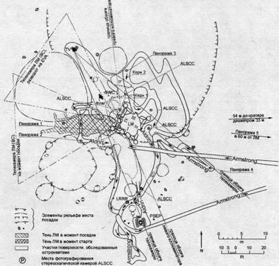 Схема места посадки "Аполлона-11" и работ астронавтов западном секторе, сзади модуля.