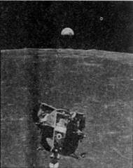 110:50:34. Астронавты подходят вплотную к задней стойке (-Z) и, подняв объектив фотокамеры почти вертикально, через затылок LM ловят в кадр маленькую голубую полусферу в бескрайнем черном небе Луны – родную планету Земля (AS11-40 – 5923,5924).