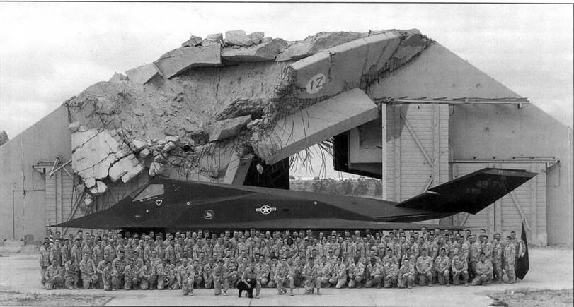 8-я эскадрилья 49-го крыла у разуршенного во время "Бури в пустыне" ангара на кувейтской авиабазе Эль-Джабер