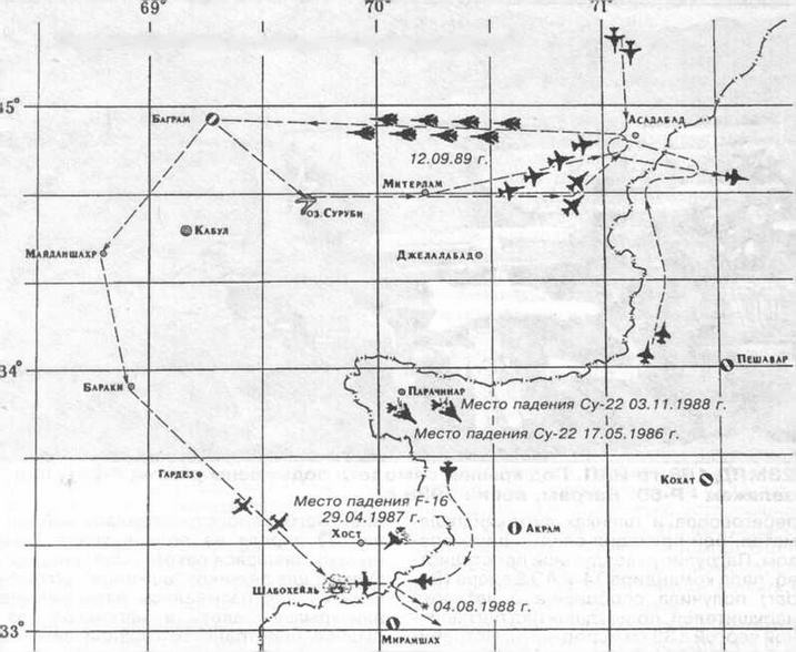В январе 1983 г. Пакистан получил из США первые F-16, резко усилившие его позиции. К октябрю 1986 г. в строю находились уже 40 самолетов: 28 F-16A и 12 учебно-боевых F-16B, сосредоточенных в 9-й, 11 -й и 14-й эскадрильях на базах Саргода и Камра. Освоив новую технику, пакистанские летчики перешли к более энергичным действиям. На их стороне были тактические преимущества "игры на своем поле": близость собственных аэродромов (поднимаясь из приграничной Камры, F-16 могли атаковать противника едва ли не на взлете), хорошее знание местности, над которой приходилось патрулировать, развернутая близ границы система РЛС и постов раннего обнаружения. Применяя излюбленную тактику "shot&run" ("ударь и беги"), летчики F-16 в случае опасности могли тут же отвернуть вглубь своей территории. Даже при катапультировании они могли рассчитывать на помощь местных жителей и скорое возвращение в строй. Советские и афганские пилоты, работая в этих районах, находились в 250-300 км от своих баз и ежеминутно опасались внезапной атаки с соседней стороны. О покидании самолета над местом, по которому прошлись бомбовым ударом, не хотелось и думать - в этом случае оставалось рассчитывать на удачу и прихваченный в полет автомат, надеясь, что он поможет продержаться до появления поискового вертолета.