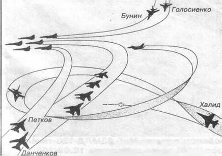 К месту стычки на форсаже рванулись обе пары прикрытия, в эфире поднялся крик и мат. Пакистанцу грозили серьезные неприятности - дальности пуска Р-24Р вполне хватало, чтобы сразить его еще перед границей, на земле даже услышали возглас: "Дай я его грохну!" Однако сравнять счет не удалось - с КП приказали всем спешно уходить, опасаясь схватки над удаленным районом, где ситуация не была выигрышной: противник мог ввести в бой новые силы, а МиГи имели небольшой запас топлива. Сбросив бомбы, Привалов повернул домой, за ним потянулась остальная группа. Замыкали строй Бунин и Голосиенко, и тут сзади снова появилась пара F-16. Пакистанцы пошли следом, намереваясь расстрелять МиГи на догоне, однако угнаться за ними не смогли: установив крылья на максимальную стреловидность, те на форсаже разогнались до скорости звука (хотя с подвесным баком существовало ограничение М=0,8). На подходе к Баграму подбитый МиГ пропустили вперед, чтобы он садился первым. Запаса топлива у него практически не оставалось: судя по расходомеру, самолет потерял уже 1200 л керосина. Оставляя мокрый след на бетоне, истребитель зарулил на стоянку, где течь прекратилась сразу после выключения двигателя - горючее кончилось. Севший следом Петков вылез из самолета и с досадой грохнул шлемом о бетонку: "Мать их..! Чтоб я еще летал на "прикрышку"! Я ж этого гада в прицеле держал!"