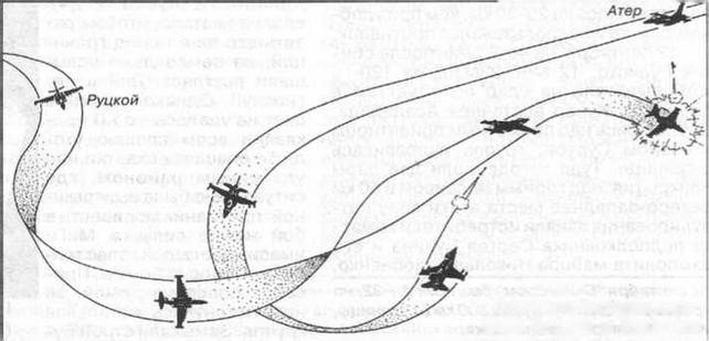 Обнаружив неприятного соседа, который подкрался намного ниже "прикрышки" и все еще не был замечен ею, Руцкой дал своим "грачам" команду "Уход, уход!" и тут же перешел на снижение, лавируя "змейкой" и стараясь раствориться на фоне гор. Однако "Береза" визжала уже неистово - противник вел его машину в прицеле и был готов к атаке. После серии маневров F-16 оказался в хвосте у Су-25, быстро с ним сблизился и с дистанции 4600 м пустил ракету. Летчик едва успел катапультироваться из разваливающегося самолета. Приземлившись и разобравшись в обрывках карты, он убедился, что оказался в 15-20 км по ту сторону границы. Впереди у него были пять дней скитаний по горам, перестрелки, попытки выйти на свою сторону и, в конце концов, плен на базе Мирамшах, откуда через неделю его и вернули пакистанские власти. Случай с Руцким пакистанцы считали единственной стычкой с советскими летчиками, а все остальные инциденты относили на счет афганских ВВС.