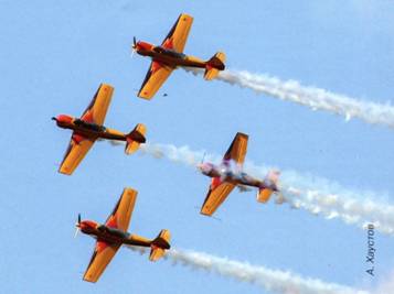 B.C. Гризодубовой, пилотажной группы «Первый полет» на трех Як-52 и одном Як-54 из Подмосковья. В авиашоу также принимали участие самолеты Як-18Т из Харькова, Ан-2 и Як-52 Центрального аэроклуба Украины им. O.K. Антонова, сверхлегкие ЛА, планеры и парашютисты. К сожалению, одиночный пилотаж на истребителе Су-27 из 831-й авиабригады (Миргород) и групповой на МиГ-29 из 40-й авиабригады (Васильков) был продемонстрирован лишь в первый день салона, а в выходные дни посетители могли видеть защитников своего неба только на земле.