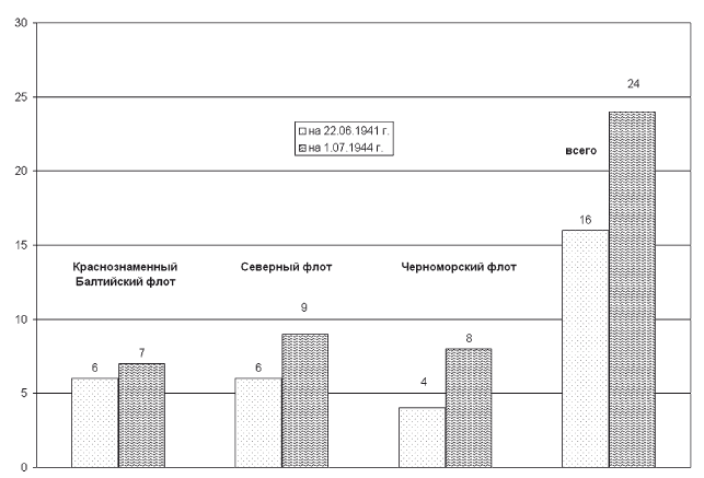 Рис. 15. Динамика роста количества боевых постов поиска, перехвата и слежения береговых частей радиоразведки советского ВМФ в Великой Отечественной войне Составлено по: ЦВМА, ф. 2, оп. 10, д. 27, 31, 32.
