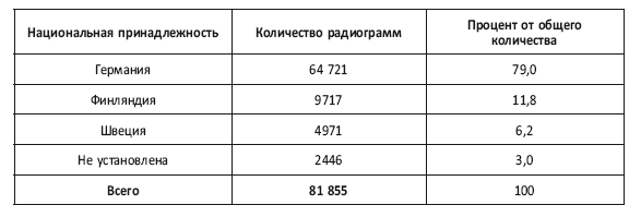 Не менее эффективно радиоразведкой вскрывалась деятельность авиации противника, в том числе и финской. Например, в июне 1944 года радиоразведка КБФ своевременно вскрыла перебазирование финской истребительной авиации с аэродромов на Карельском перешейке на аэродромы Утти, Котка, и Хамина, а также прибытие с центрального фронта двух групп транспортной авиации на аэродром Таллин[720]. Кроме того, ночью 18 августа 1944 года радиоразведка обнаружила в Нарвском заливе немецкие эсминцы типа «?». Их радиообмен носил нервозный характер, проходили радиограммы высокой срочности. В результате, по сведениям морской РЭР, сторожевые корабли и торпедные катера КБФ вышли в район обнаружения сил противника в Нарвский залив, где и застали все четыре немецких эсминца, подорвавшихся на минах. 107 немецких офицеров и матросов, в том числе командир дивизиона эсминцев, были подняты с воды и взяты в плен.