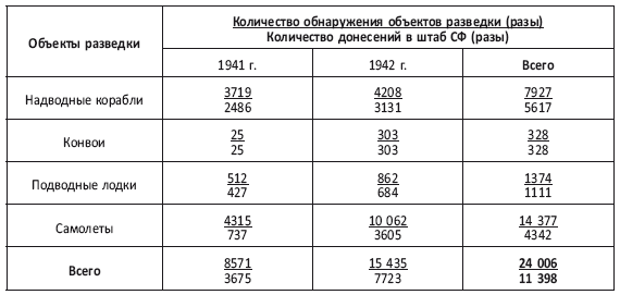 К лету 1942 года радиоразведка Северного флота добилась такого положения, когда к ее сведениям на флоте стали относиться как к достоверным[676]. Итоги деятельности радиоотряда Северного флота за 1941–1942 года приведены в таблице 7.